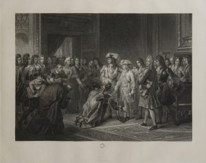 GÉRARD (François). Louis XIV présentant Philippe V aux ambassadeurs d’Espagne, 1826 55,7 x 69,1 cm ►Superbe estampe gravée par Alfred Johannot. Épreuve sur chine appliqué avant la lettre. La première planche qu’Alfred Johannot fit...