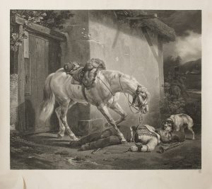VERNET (Horace). Le Trompette blessé, 1822 Gravure63,5 x 70,3 cm L’une des plus belles gravures réalisées par Tony Johannot. Exemplaire sur papier de Chine appliqué sur papier vergé fort, en état avant la lettre. Déchirure sans manque et...