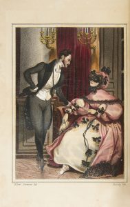Superbe Keepsake réunissant des textes de Jules Janin, Henry Martin, Gustave Drouineau, du vicomte de Marquessac, d’Alexandre Dumas, Gustave Albitte, Émile Deschamps, Jules Lacroix, du vicomte d’Arlincourt, du bibliophile Jacob, de Petrus Borel et d’Eugène Sue. Il est illustré d’un faux titre gravé sur acier en noir et bleu, et de 12 très belles lithographies originales hors texte coloriées et gommées à l’époque, d’après Alfred et Tony Johannot, Devéria et Marie-Alexandre Alophe, dit Menut.