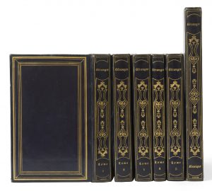 •Musique des chansons de P. J. de Béranger contenant les airs anciens et modernes les plus usités.Paris : Perrotin, 1834. — 5 volumes in-18 (151 x 96) et un volume in-8 (206 x 130) : portrait, xliij, 252 pp., 27 planches ; (2 ff.), 260 pp., 31 planches ; (2 ff.), 260 pp., 34 planches ; (2 ff.), 82, 93 pp., 4 planches ; (2 ff.), xlvij, 249 pp., 14 planches ; (2 ff.), 272 pp., (4 ff.). Maroquin bleu nuit, filets dorés en encadrement sur les plats, dos lisse orné, roulette dorée intérieure, tranches dorées (Roullin).