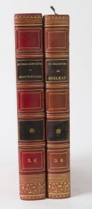 BOILEAU-DESPRÉAUX (Nicolas Edme). Œuvres… avec une notice Par M. Daunou. Paris : J. Desmalis, 1840. — In-8, 253 x 166 : titre, portrait, (2 ff.), 507 pp., 22 planches. Demi-veau cerise, dos à nerfs orné, tranches marbrées (reliure de...