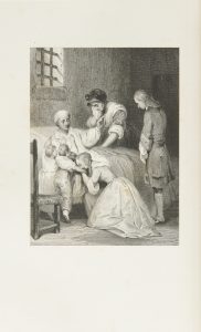 Premier tirage de l’illustration, se composant d’un frontispice représentant le portrait de Goldsmith, gravé sur bois par Andrew Best et tiré sur papier de Chine collé, de plus de cent vignettes sur bois dans le texte, gravées par Andrew Best, Lacoste, Provost, etc. d’après les dessins de C. Jacques, Marville, Janet-Lange, etc., et de 10 planches sous serpentes légendées, gravées sur acier par W. Finder d’après Tony Johannot.