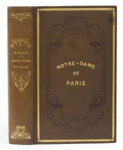 HUGO (Victor). Notre-Dame de Paris. Paris : Eugène Renduel, 1836. — In-8, 205 x 130 : frontispice, (2 ff.), 631 pp., 11 planches. Maroquin brun, filet gras doré et plaque rocaille à froid formant encadrement sur les plats, titre doré au centre...
