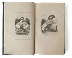 Jules Janin fait ici les louanges du célèbre mime Jean-Gaspard Debureau (1796-1846) qui joua au théâtre des Funambules de 1820 jusqu’à sa mort. Loué non seulement par Janin mais également par Charles Nodier, Théophile Gautier, Théodore de Banville ou encore Charles Baudelaire, il resta célèbre grace à la création du personnage de Pierrot qui sera immortalisé un siècle plus tard par Jean-Louis Barrault dans Les Enfants du paradis.L’édition est illustrée de deux frontispices, l’un représentant Debureau en Pierrot gravé sur bois par Porret d’après le peintre Auguste Bouquet (1810-1846), l’autre figurant Debureau en cordonnier gravé sur bois par Cherrier d’après Bouquet également.