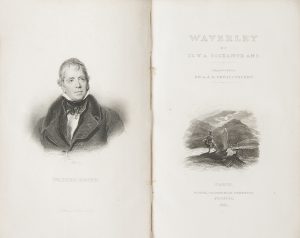 Édition peu courante des œuvres de Walter Scott, illustrée de 6 portraits hors texte dont celui de l’auteur gravé par Hogwood, d’un fac-similé d’autographe hors texte dépliant, de 30 titres gravés, chacun orné d’une vignette et de 51 planches (sur 52), dont la suite des 30 figures d’Alfred et Tony Johannot et une suite de gravures anglaises.