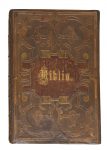l’imitation des décors du XVIe siècle, entourant une pièce centrale de veau brun orné du titre Biblia en lettres gothiques dorées, le second plat comprenant le même décor à froid ; dos à nerfs orné, roulette à froid en encadrement à l’intérieur, tranches dorées (reliure du XIXe siècle).