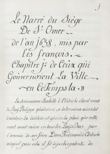 Le second manuscrit comprend 277 pages d’une écriture fine et parfaitement lisible. Il contient le troisième et le quatrième livre d’un ouvrage plus ample, portant respectivement sur les princes qui ont régné sur la ville de Saint-omer depuis l’origine et sur « La fidélité de la ville de St Omer et des grands privilèges qu’elle a eut. »