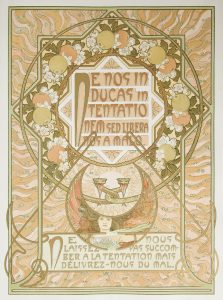 C’est dans cet esprit qu’il conçut ce livre et pour ce faire il propose une analyse écrite et picturale des 7 versets de la prière, qu’il divise en 3 pages. La première, en couleurs, contient le verset en latin et en français dans un décor floral flamboyant avec une figure féminine symbolique. La seconde page, également en couleurs, propose le texte de Mucha interprétant le verset, orné d’une lettrine et entouré d’un cadre floral. La troisième page comprend un dessin allégorique imprimé en photogravure, illustrant la réponse philosophique de Mucha sur le verset.