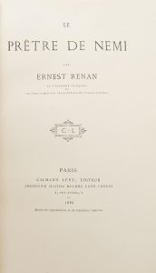 RENAN (Ernest). Le Prêtre de Nemi. Paris : Calmann Lévy, 1886. — In-8, 244 x 160 : (2 ff.), XIV pp., (1 f.), 134 pp., (1 f.), couverture imprimée. Demi-maroquin noir à larges coins, dos à nerfs, tête dorée, non rogné, couverture conservée...