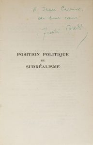 BRETON (André). Position politique du surréalisme.Paris : Sagittaire, [1935]. — In-8, 186 x 118 : 174 pp., (3 ff. premier blanc), couverture imprimée. Édition originale. Exemplaire enrichi d’un envoi autographe de l’auteur adressé au...