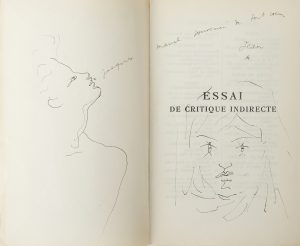 L’envoi est accompagné de 2 DESSINS ORIGINAUX DE COCTEAU, un profil d’homme sur le feuillet blanc en regard du faux titre et le visage de face, sans doute d’une femme, sur le faux titre.