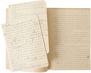 Nous avons ici les 50 premiers feuillets, le reste du tapuscrit a été présenté en vente à Paris le 17 juin 2016 ; il présentait les feuillets 50 à 297.