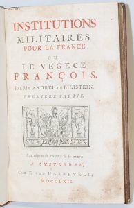 ANDREU DE BILISTEIN (Charles-Léopold) - Institutions militaires pour la France, ou Le Végèce François. Amsterdam, E. van Harrevelt, 1762, 2 parties en un volume in-8, veau granité, dos lisse orné (reliure de l' époque).