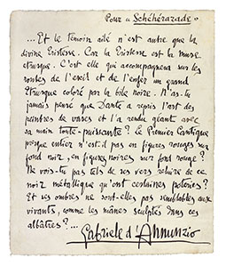 Gabriele d’ANNUNZIO (1863-1938). Manuscrit autographe signé, Pour “Schéhérazade”, [1910] ; 1 page in-4.