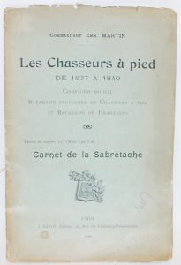 MARTIN (Emmanuel) - Les Chasseurs à pied de 1837 à 1840. Compagnie modèle. Bataillon provisoire de chasseurs à pied et bataillon de tirailleurs. Paris, Leroy, 1903, gr. in-8, ill. in-t., broché. Frontispice en couleurs