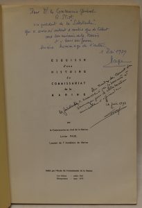PAGE (Lucien) - Esquisse d'une histoire du Commissariat de la Marine. S.l., École du Commissariat de la Marine, 1979, in-4, broché. Envoi.