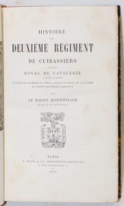 ROTHWILLER - Histoire du deuxième régiment de cuirassiers, ancien royal de cavalerie (1635- 1876). D'après les Archives du Corps, celle du Dépôt de la Guerre et autres documents originaux. Paris, Plon, 1877, in-8, demi-toile rouge, dos lisse,...