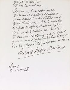 Miguel Angel ASTURIAS (1889-1974). Poème autographe signé, Me sueñas, ya lo se..., Paris 31 août 1968 ; 2 pages in-4 ; en espagnol.