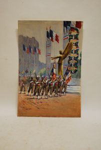 LEROUX (Pierre-Albert) - [Défilé de troupes étrangères à la Libération]. S.l., 1945, 32,5 x 50 cm. Aquarelle et gouache sur papier. Aquarelle originale de Pierre-Albert Leroux (1890-1959) avec rehauts de gouaches.