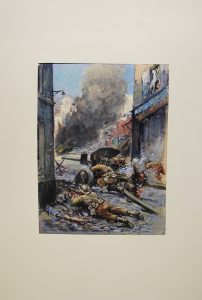 LEROUX (Pierre-Albert) - [Scène de combat dans une ville]. S.l., 1945, 29,5 x 38 cm. Gouache sur papier. Gouache originale signée et datée 1945.