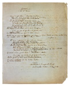 Très bel ensemble du « Félibre Irlandais ». Amélie-les-Bains 1864-865. 3 poèmes pour l’Armana prouvençau, couverts de corrections et additions autographes de Mistral, qui corrige aussi le prénom William en Guihèn : Gramaci à l’Amour (Grand Merci à l’Amour), L’Avuglo di Baus, Lou Paumié… – Woolley Hill House 4 octobre 1866. Billet en français à Roumanille accompagnant plusieurs poèmes en provençal : « si vous aviez de la place dans l’Armana de 67 j’en serai bien-aise de les faire rentrer dans la collection. Je crois que vous trouveriez le Nouvè pas mal, et assez natural & moral pour vos lecteurs ». Il a aussi composé des pièces en « ancienne langue des troubadours, c’est-à-dire, du XIIème siècle – le seul peut-être depuis le Roi René ». – Manuscrit de 3 poèmes en provençal : La Machoto, Nouvè (dédié à Gabriel Azaïs de Béziers) ; Li Dous Parpaiouns blanc ; La Lengo Romano (on joint un manuscrit autographe de Mistral refaisant entièrement ce dernier poème). –Waterford, 1880. Manuscrit de 2 poèmes d’après Villon : Lou darnié Felibre !, et Ballado à la façoun de Villon. – [Mai 1891]. Poème Au Tombeù de Roumaniho, à Sant-Roumiè. – Traduction en provençal de 2 poèmes de Walt Whitman : La Musico et La Recounciliacioun. On joint 5 plaquettes imprimées de poèmes : Lou vin dou Felibre (1866) ; La Cansoun Capouliero dou Felibrige (Plymouth, 1877) ; Un Demenche dou Mes de Mai (Montpellier, 1877) ; Septentrioun avec envoi a.s. à Roumanille (Antibes, 1878) ; Nouvè (Noël, 1878). Plus le prospectus de son Parpaioun blu (1868) ; et 2 ouvrages consacrés à Bonaparte-Wyse par Paul Mariéton et Frédéric Donnadieu avec dédicaces a.s. à Roumanille par les auteurs.