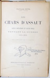 DUTIL - Les Chars d'assaut. Leur création et leur rôle pendant la guerre. 1915-1918. Paris, Nancy, Strasbourg, Berger-Levrault, 1919, in-8, ill. in-t., demi-basane fauve, dos à nerfs (reliure de l' époque). Dos frotté et petite déchirure sans...