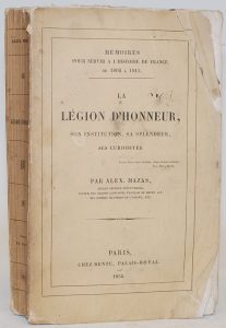 MAZAS (Alexandre) - Mémoires pour servir à l'histoire de France de 1802 à 1815. La Légion d'Honneur, son institution, sa splendeur, ses curiosités. Paris, Dentu, 1854, in-8, broché. Petit accroc à la couv.