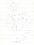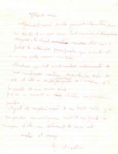 ennui. Tout s’en mêle, l’atmosphère orageuse, le climat maritime »… Iris Clert « s’est montrée entousiaste de mes nombreuses créations de septembre datées de Vix et elle a semblé agréablement surprise de l’abondance et la qualité de mon œuvre peinte. J’ai en ce moment en chantier une grande peinture. Ayant été remplacé auprès de ma belle-mère j’ai pu peindre en conséquence mais il me faut me réocuper d’elle, au détriment de mon art »… [C’est en 1960 que Chaissac prend contact avec Iris Clert, qui lui organisera en octobre 1961 sa première grande exposition personnelle dans sa galerie du Faubourg Saint-Honoré, intitulée Le monde fabuleux de Gaston Chaissac.].Au dos de la lettre, grand dessin au stylo rouge d’un personnage-animal.