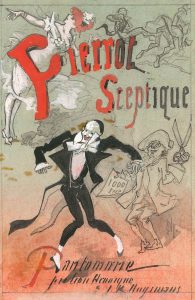 Jules Chéret (1836-1932). Dessin original signé du monogramme «JCh. », Pierrot Sceptique, [1881] ; mine de plomb, plume, encre de Chine et aquarelle sur papier bleuté, 15,7 x 10 cm, contrecollé..Maquette de couverture pour Pierrot Sceptique,...