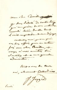et son admiration : « Tout à vous de cœur ami, charmant Cassandrius »..On joint une L.S. au même, où Ingres dit ne pouvoir sortir : je garde la chambre pour soigner mes yeux malades »... (1 p. in-8).