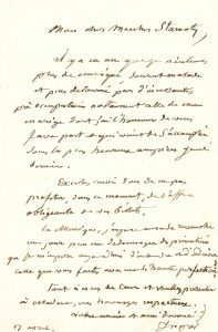 musique, souvent malade et puis détourné par d’incessantes préoccupations nottament celle de mon mariage dont j’ai l’honneur de vous faire part et qui vient de s’accomplir sous les plus heureux auspices jeudi dernier ». Il regrette « de ne pas profiter, dans ce moment de l’offre obligeante de vos billets. La Musique, j’espère, aura sa revanche un jour pour me dédommager des privations que je m’impose aujourd’hui d’entendre et d’admirer celle que vous faites avec une si haute perfection ! »… .Pablo PICASSO : voir n° 216.