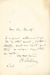 Hector BERLIOZ. L.A.S., Lundi, à Camille Stamaty ; ¾ page in-8..« Je ne pourrai malheureusement pas être des vôtres mercredi ; j’ai tant à travailler avant mon départ que le temps me manque. Croyez à tous mes regrets »…