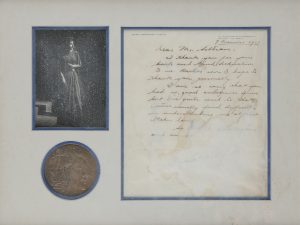 *Maria CALLAS (1923-1977). L.A.S., Milan 9 décembre 1957, à Mr. Seltsam ; 1 page in-4 à son en-tête ; en anglais (encadrée avec enveloppe, photographie et médaillon commémoratif ; fortes mouillures affectant le bas de la lettre et la...