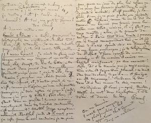 5 h. 20, et je ne vais arriver à Nuremberg qu’à 7 h. ½ ! – Puis il faudra se recoller en wagon pour gagner Bayreuth j’y serai vers 10 h. du soir, probablement ! Ces trains n’en finissent pas ! »….Bayreuth – Vendredi 26 juillet [18]89. « Hier soir, cette merveille de Parsifal. Je passe ici d’inoubliables soirées. – Ce soir repos, demain aussi ; dimanche Parsifal lundi Tristan. – Ce soir, le larbin de Made Wagner, ou plutôt son homme de confiance, est venu m’inviter à aller souper à Wahnfried. Tu vois, je suis dans les honneurs ; j’y vais avec les Van Dyck, naturellement, et je trouverai là Lévi, le ch[ef] d’orch[estre] de Munich, qui est charmant pour moi, mon vieux Mottl, enfin un tas de gens qui peuvent m’être utiles. […] On me collera au piano probablement […] Ce Bayreuth est une vraie boîte à cancans, – aussi je m’observe énormément ! »....[Bayreuth 29 juillet 1889] Dimanche minuit et 1/2. « Représentation du merveilleux Parsifal. Pendant le 1er entr’acte, visite aux Wagner, dans leur loge, présentations et tralalas. Je descends : je rencontre Lamoureux qui me demande où on pisse, je le mène pisser. En revenant, les inévitables Chevillard apparaissent, bras dessus bras dessous […] Les Chausson m’invitent à souper pour demain. Ce n’est pas Van Dyck qui chante aujourd’hui ; c’est sa doublure ; la doublure est faiblarde, alors Ernest est aux anges, naturellement. Dans le deuxième entracte, je vais chercher la photographie que l’on m’a faite au théâtre même, comme homme éminent », mais il trouve que ces photos le vieillissent… Il reçoit la lettre l’avertissant que sa vieille nourrice Nanine a eu une attaque ; il est très inquiet « je dois rester ici jusqu’à jeudi ; comme j’ai pris ces billets, fort chers, il faut bien en profiter ! Je vais vivre maintenant dans des transes continuelles, c’est assommant ! Mottl dirige exceptionnellement Parsifal jeudi et il veut que je reste pour le voir conduire ; je ne puis pas, pour un jour de plus lui refuser ça ». Il se dépêchera alors de rentrer à Paris. Pour Tristan, « Mottl me met dans l’orchestre, à côté de lui »....Correspondance (89-78, 89-86, 89-88). Ancienne collection Francis Poulenc.