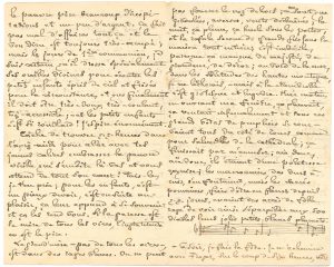 avril 1890. « Je vois, la petite maman, que tu ne t’en es pas si mal tirée que ça, avec ta grosse malle et tes accessoires ; on t’aura prise pour la femme du préfet de police, à ce que je suppose ; tu fais trembler le personnel des gares, et le sergent de ville se roule à tes pieds ; je ne te vais pas à la cheville, la petite femme, le loup est dépassé ! Embrasse bien les petits loups pour moi et particulièrement le louveteau qui accomplit demain un acte caractéristique et plein de douceur. Recommande-lui de demander à Celui qu’il invoque de nous protéger tous, nous qui cherchons à faire de notre mieux et qui ne sommes pas des méchants ; dis-lui de demander pour la maman la bonne vue et la santé, des bulletins propres pour le grand frère, et pour le pauvre père beaucoup d’inspiration et un peu d’argent. Ça fait pas mal d’affaires tout ça et le bon Dieu est toujours très occupé ; mais les jours de 1ère communion, je suis certain qu’il dresse spécialement ses oreilles divines pour écouter les petits enfants épris de ciel et frisés pour la circonstance, et que finalement il doit être très doux, très coulant, très accessible ». Il faudra aller embrasser la vieille Nanine : « pour les enfants, c’est un pieux devoir, c’est ensuite un plaisir, ça leur apprend à se souvenir et ça les rend bons. Si la paresse est la mère de tous les vices, l’ingratitude en est le père ». À La Membrolle, « ce ne sont que giboulées, averses, vents déchaînés […] Hier matin, en ouvrant ma fenêtre, ça pleuvait, ça ventait infernalement et tous ces grands bêtes de peupliers se courbaient tous du côté de Tours comme pour saluer celles de la cathédrale […] Les marronniers, des durs-à-cuir, s’en foutaient, mais les sacrés pommiers, fiers d’être en fleurs depuis q.q. jours, avaient des accès de folle rage de voir ainsi s’éparpiller aux 500 diables leurs jolis petits blancs plumets » [4 mesures de musique]. Il passe sa vie « entre une table et un piano »....[Paris, 29 juin 1890]. Visite à Nanine, « avec fraises et cerises : ravie, la Nanine ; elle avait communié le matin, et prié pour tes yeux ! Elle t’embrasse ainsi que le petit louloup »... Voyage à Rueil avec Catulle Mendès (projet de reprise de Gwendoline) : « Catulle ne veut pas de l’Eden ; il se charge de tout ; je vais le laisser faire, parce que c’est trop grave et que nous pourrions croquer le marmot trop longtemps si nous ne prenions pas un parti dès maintenant. Enfin, aujourd’hui, je serai évasif ; laissons faire Catulle. Il m’a dit qu’on me ferait faire n’importe quoi en pleurant dans mon gilet »….[Munich] 19 novembre 1890. « Hier soir, répétition générale ; il y avait dans les 300 personnes. Grand succès, rappel chaleureux du public et de l’orchestre qui est très emballé : j’ai donc montré ma hure. L’interprétation, dans son ensemble, n’est pas meilleure qu’à Karlsruhe ; c’est plus grand, voilà tout. […] on ne se foule pas la rate énormément, mais ils croient tous se la fouler. Encore un théâtre où il y a trop de vieux »….Correspondance (90-52, 90-86, 90-137). Ancienne collection Francis Poulenc.