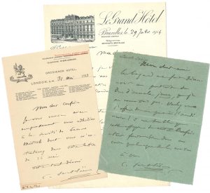 connaissais pas. Voulez-vous l’offrir de ma part à l’Académie ? Il me semble que cette effigie de notre bienfaiteur ferait bien dans un coin quelconque de la maison »… Londres 31 mai 1913, à Robert de Flers. « Je vous envoie avec empressement mon adhésion à la Société de Secours mutuels »… Bruxelles 29 mars 1914, [au même] : « Veuillez je vous prie faire part à tous mes amis du Figaro de l’indignation que j’éprouve au sujet du scandaleux acquittement d’hier »… [Henriette Caillaux était acquittée de l’assassinat de Gaston Calmette, directeur du Figaro.]
