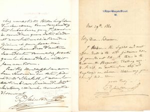 Prosper SAINTON (1813-1890) violoniste. 2 L.A.S., [Londres] 1861-1865 ; 3 pages in-8 ; la première en anglais..29 novembre 1861, au pianiste Charles Salaman. Il croit que le duo le plus léger et le plus efficace est le vieux Guillaume Tell, mais...