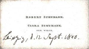 Robert SCHUMANN. Carte de visite avec 2 lignes autographes, 12 septembre 1840, adressée au pianiste Camille Stamaty ; 4,5 x 8 cm..Rare carte de visite au nom de Robert Schumann / Clara Schumann, / geb. Wieck, portant de la main de Schumann la...