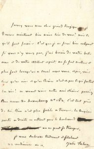 maintenant bien moins loin de vous ? » Elle l’invite à venir la voir : « j’ai besoin de votre belle âme et de votre excellent esprit. On se sent merveilleux et plus fort lorsqu’on a causé avec vous. Et puis, voir ceux qu’on aime et qu’on révère n’est-ce pas ce qui soutient la vie ! […] je vous embrasse tendrement et filialement »….On joint une l.a.s. de Rosalie Talma (1765-1804), 19 mars 1790, à son frère Talma, amusante lettre au sujet de projets de mariage (3 p. in-4, adr.).