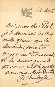 Pauline VIARDOT (1821-1910) cantatrice. L.A., 12 avril [1901 ?], à son fils Paul Viardot ; 1 page in-8 à vignette Vendredi. .« Oui, mon cher Paul, je te donnerai les cinq mille francs que tu demandes pour ton voyage au Transvaal ; tu les auras...