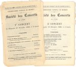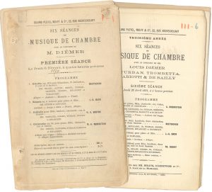 des 15 saisons de concerts donnés aux Salons Pleyel, Wolff et Cie, 1879-1893 (manque le programme du 5e concert de la 3e saison) ; la première séance a eu lieu le 6 février 1879 avec le concours de Louis Diémer. Quelques notes témoignent de modifications de programmes ou d’interprètes ; au dos du programme du 18 février 1886, croquis pour les emplacements des pupitres et du piano selon les morceaux..Société des Concerts du Conservatoire national de Musique, 1892-1900, sous la direction de Paul Taffanel.
