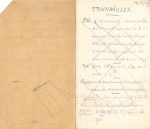 répétitions d’orchestre pour Lohengrin du 25 juillet au 10 septembre 1891 (2 p. in-fol. à en-tête du Théâtre national de l’Opéra) ; la première eut lieu le 16 septembre 1891 sous la direction de Charles Lamoureux (assisté de Taffanel comme 3e chef de l’orchestre de l’Opéra)..Tannhäuser (1895). Carnet in-16 (14/2/95) au crayon : notes sur la composition de l’orchestre et la répartition des instruments, l’établissement du matériel, etc. Notes autographes (25 p. in-8, la plupart au crayon, avec de nombreuses ratures et corrections : notes sur les répétitions, les corrections à faire, les musiciens, les chanteurs (Van Dyck, Lucienne Bréval), citation musicale, etc. L.A.S. d’Alphonse Hasselmans, avec musique autographe jointe sur les parties de harpe. 4 L.A.S. (mars-avril 1895) de l’éditeur Jacques Durand concernant le matériel d’orchestre de Tannhäuser. L.A.S. de Charles Risler demandant un billet pour le bal de l’Opéra. La première représentation de la reprise de Tannhäuser à l’Opéra de Paris dirigée par Taffanel eut lieu le 13 mai 1895.].Die Meistersinger (1896-1897), première représentation, dans une traduction française d’Alfred Ernst, des Maîtres Chanteurs de Wagner à l’Opéra de Paris le 10 novembre 1897, sous la direction de Taffanel, avec notamment Francisque Delmas (Sachs), Albert Savarez (Walther), Lucienne Bréval (Eva) et Maurice Renaud (Beckmesser). Cette œuvre était particulièrement chère à Taffanel qui, après l’avoir découverte à Bayreuth en 1892, la proposa au directeur de l’Opéra Pedro Gailhard. Cet ensemble de notes et de correspondances reflète le soin apporté à la préparation de cette représentation qui rencontra un vif succès et marqua les esprits. Taffanel s’est entre autres longuement renseigné sur les traditions de Bayreuth, sur le déroulement des répétitions et des représentations et sur les arrangements des œuvres de Wagner, ainsi que nous l’indique sa correspondance avec ses contacts dans le « temple de Wagner » et les nombreuses notes. – 3 brouillons autographes de lettres à Gustav Fridrich, violoniste de l’orchestre de Bayreuth, demandant des détails sur la partition de la Walkyrie, les répétitions et les représentations de Bayreuth, la façon de faire étudier et de conduire de Richter et de Mottl, « des points de détail, d’exactitude d’exécution », avce citations musicales de passages incorrects ou problématiques, regrettant que les partitions de Wagner en vente soient pleines d’incorrections : « Il me semble que Wagner mériterait qu’on le traitât en Allemagne avec autant de respect que Bach ou Beethoven ont été traités »… – 6 L.A.S. de Gustave Fridrich adressées à Taffanel (une incomplète et 2 écrites avec son beau-frère Édouard Risler, qui travaillait alors comme répétiteur à Bayreuth [Taffanel souhaitait le faire venir travailler à l’Opéra]). Le violoniste se tient la disposition de Taffanel pour lui fournir tous les renseignements dont il pourrait avoir besoin sur l’exécution des quatre œuvres de Wagner. 3 juillet 1896, renseignements sur la Walküre, avec citations musicales : « J’assiste à toutes les répétitions au piano et je cause souvent alors avec Mme Wagner »… En réponse au « petit questionnaire » [le 15 juillet 1896], il émet plusieurs observations faites lors de la répétition avec Félix Mottl, à qui il a soumis, ainsi qu’à Richter, les fautes relevées par Taffanel, désormais corrigées « dans le Temple de Wagner »… Risler prend la plume et ajoute à la suite « deux changements faits par Wagner en 76 à cause de la clarté des paroles ; c’est (partition piano) page 174 et page 185 [ici quelques mesures] », puis il annonce que Mottl donnera en septembre à Karlsruhe une série de représentations, dont les Maîtres Chanteurs… Fridrich détaille dans plusieurs courriers l’organisation des répétitions : « C’est Richter qui monte tout. Mottl fait généralement les répétitions au clavier et il est étonnant pour cela, il conduira ensuite un ou deux cycles. C’est inouï de pouvoir monter quatre ouvrages en si peu de rép[étitions]. Mais les éléments sont parfaits et la plupart des musiciens ont déjà joué ces ouvrages et Richter les connaît par cœur. Il a une grande concision et une grande netteté dans ses observations, il ne perd pas une minute. Il a une sûreté, une précision remarquables. Très sobre de gestes, toujours calme, dans les plus grands forte pas le plus petit mouvement excentrique. […] Il exige beaucoup, il obtient tout ce qu’il veut »… Il a eu le plaisir d’entendre Lilli Lehmann en répétition privée… Il partage des considérations sur la disposition de l’orchestre à Bayreuth qui ne convient pas selon lui à l’interprétation de la Tétralogie, etc. – 6 L.A.S. du traducteur Alfred Ernst (avec 2 brouillons de Taffanel), sur sa traduction, et répondant longuement lors des représentations de Bayreuth à des questions de Taffanel, avec de nombreux exemples musicaux… – Nombreuses notes autographes de Taffanel sur 2 petits carnets et des feuilles éparses (qqs à en-tête de l’Opéra), la plupart au crayon : notes de répétitions, deux mesures au crayon sur un morceau de papier à musique, corrections, précisions à demander à Fridrich et Risler, « points douteux », « indications à mettre sur ma partition », indications des coupures, coups d’archet, liste des interprètes, programme des répétitions, dates des congés des artistes, entrées d’orchestre pour la répétition générale, etc. Plus un petit carnet avec les thèmes musicaux. – Quelques lettres de divers correspondants (H. Eichel, G. Hartmann, Antoine Lascoux, Ad. Sax fils, etc.). – Brouillons de réponses de Taffanel à des critiques. – Documents imprimés : mise en scène reprographiée de Pantomime de la Scène 1ère, brochure les Maîtres chant