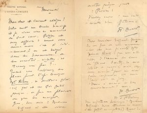 sa partition le jour qu’il a eu cette terrible attaque dont il est mort ; de plus je la connais par cœur » ; il l’apportera à Paris avant d’aller à Toulouse où on doit jouer sa Cantate. 3 juillet 1895 : il annonce son mariage. 21 juillet 1896 : on doit donner son Ouverture de Fête à l’Institut, mais on lui conseille de remplacer la flûte solo par un violon solo : il demande de la faire entendre « au plus parfait des chefs d’orchestre, et de soumettre le passage en question à l’éminent flûtiste »…Mai 1902, à propos de Pelléas et Mélisande de Debussy : « Pelléas est assez difficile à mener sans accroc, mais c’est si intéressant ! On est baigné dans des harmonies et des sonorités … violettes… ne trouvez-vous pas ?»… Félicitations, demandes de places, recommandations… On joint 2 brouillons de réponse de Taffanel à Büsser au sujet du Requiem de Gounod.