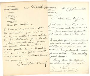 demande de précisions sur l’exécution des coupures dans la Walkyrie à l’intention de son gendre engagé comme basse pour le rôle de Wotan à l’Opéra de Nice), Charles Lamoureux (8, 1893-1898, dont demandes d’autorisations pour certains de ses musiciens, engagés à l’Opéra et à la Société des Concerts du Conservatoire, de partir faire des tournées sous sa conduite, et lettre de recommandation, plus minute de réponse de Taffanel), Georges Marty (12, 1897-1902, relatives à des répétitions, remerciements, recommandations et félicitations), Gabriel Parès (3, 1898 et s.d., pour l’envoi de partitions), François Ruhlmann (1896, au sujet de la mise en place de séances de musique de chambre pour instruments à vent par son orchestre du Cercle d’Aix-les-Bains).