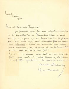 Claude DEBUSSY (1862-1918). 2 L.A.S., août 1900, à Paul Taffanel ; sur 1 page in-4 chaque..Sur La Damoiselle élue (dirigée par Taffanel au 7e concert de l’Exposition universelle le 23 août 1900)..Mercredi 7 août 1900. « Je pensais avoir...