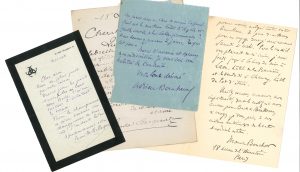 Bertrand (3), Maurice Bouchor, Adolphe Bourdeau, Victor Charpentier, Guy de Charnacé, Charles Chincholle, Constant Coquelin (2), Coquelin Cadet (3), Eugène Crosti, Edmond Duvernoy (3), comte Franchi-Verney, Alberto Geloso, Frederic Griffith, Gilbert Gravina, Félix Galipaux, Alphonse Hasselmans, Louis et Gérard Hekking, Henri Heugel, Albert Lavignac (3), Émile Lemoine (de La Trompette, 26), Camille Le Senne, Valère Mabille (10), Charles Malherbe (3), Henri Marteau, Catulle Mendès, Raoul Madier de Montjau, Alphonse Mustel, Henri Roujon, Firmin Touche (3), George Vanor, Maximilien Vieuxtemps, etc. On joint de nombreuses cartes de visite a.s. ; plus quelques programmes et documents divers.