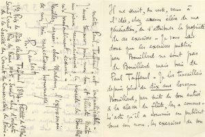 prie d’y placer l’un de ses amis. Cahors 9 septembre 1902, sur ses excursions..3 décembre 1913, à Mme Taffanel, sur la paternité des Exercices journaliers pour flûte publiés par Henri Bouillard, ancien élève de Taffanel : « Je déclare avoir travaillé dès l’année 1890 avec mon maître Paul Taffanel les exercices publiés dernièrement par Bouillard. Lors de sa nomination comme professeur au Conservatoire de Paris en 1893, mon maître fit travailler à tous les élèves de sa classe ses exercices. Chaque élève pouvait copier ces études, mais elles restaient, quoique non éditées, la propriété de notre Maître. Il ne serait, du reste, venu à l’idée, chez aucun élève de ma génération, de s’attribuer la propriété de ces exercices ». Il se dit « écœuré » par cet acte « inqualifiable ». Jeudi, pour un rendez-vous chez un avocat..[5 mai 1938], à Marie Samaran [Taffanel] : « Vous pensez bien que chaque fois que j’ai l’occasion de dire publiquement mon admiration et ma reconnaissance pour mon cher grand Maître, je ne la manque pas ! Des artistes comme lui sont très rares et il faut que les jeunes générations le sachent ! » (avec une coupure de presse : « Pourquoi je quitte la direction des Concerts du Conservatoire » par Ph. Gaubert].