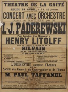 dirigé par Paul Taffanel, le 29 avril 1897 au Théâtre de la Gaité, pour l’érection d’un monument au compositeur et pianiste Henry Litolff (1818-1891) [il sera érigé en 1900 à Colombes].