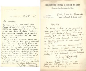 dépose sa carte de visite : « J’avais à vous demander de ne pas oublier mon Psaume si vous avez cette année des auditions d’œuvres inédites » ([février 1894])… Il revient à plusieurs reprises sur son souhait de lui faire entendre ce Psaume pour chœur et orchestre, et envoie la partition chant et piano de l’œuvre, pour lecture par Comité de la Société des Concerts ; il est sûr de la parfaite exécution de l’œuvre… Il a fait entendre une admirable cantate de Bach pour Basse Solo, qu’il croit jamais encore exécutée en France : « Le baryton Daraux qui a vraiment une voix et un style de concerts y a été merveilleux » (22 décembre 1898)… « Ma Symphonie dont vous avez si bien dirigé le final aux Concerts du Trocadéro n’a pas semblé vous déplaire. Ce serait peut-être bien audacieux de ma part d’en demander l’exécution à la Société des Concerts. Qu’en pensez-vous ? » (17 septembre 1900). Prière de lui permettre d’assister à une répétition générale ; introductions de M. Krauss, premier prix à Nancy, et de Mlle Juliette Lair, autre élève qui « a plus de dispositions que d’acquit » (11 octobre 1900) ; évocation du travail ardu pour préparer la Neuvième Symphonie ; envoi des partitions d’une cantate et de sa Fantaisie, etc.