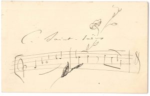 création de sa Romance pour flûte op. 192, le 6 avril 1872 à la Société Nationale, salle Pleyel, avec Saint-Saëns lui-même au piano..Saint-Saëns a inscrit à l’encre noire les deux premières mesures de la Romance, dessiné une branche fleurie, et signé..Une note explicative de la fille de Taffanel est jointe.